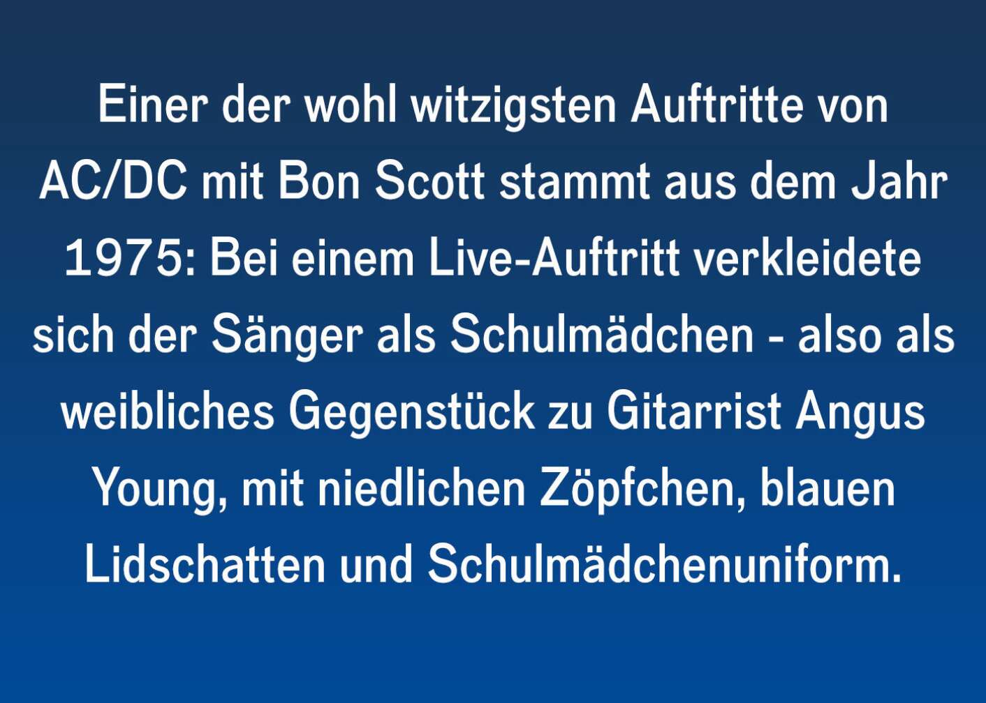 Durch eine Zeitungsanzeige wird Scott auf eine Stelle bei einer Band aufmerksam - als Chaffeur, doch 1974 sollte er ihr Sänger werden und Rock-Geschichte schreiben: Es handelte sich um AC/DC. Als Frontmann der Band eroberte Bon Scott die Rockwelt und stieg zur Legende auf. Gemeinsam feierten die Jungs Erfolge mit unvergesslichen Songs wie "T.N.T", "Dirty Deeds Done Dirt Cheap" oder "Highway to Hell" und erlangten weltweiten Ruhm. AC/DC hatten lange nach ihrem Sound gesucht - mit Bon Scott hatten sie das perfekte Puzzleteil gefunden.