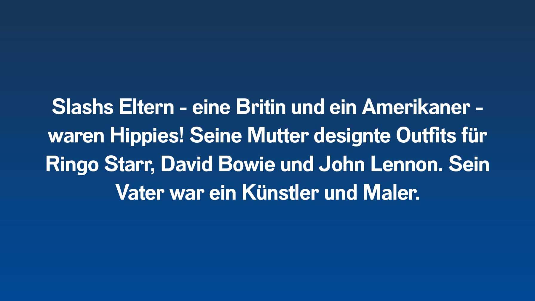 • Slashs Eltern - eine Britin und ein Amerikaner - waren Hippies! Seine Mutter designte Outfits für Ringo Starr, David Bowie und John Lennon. Sein Vater war ein Künstler und Maler. ROCK ANTENNE