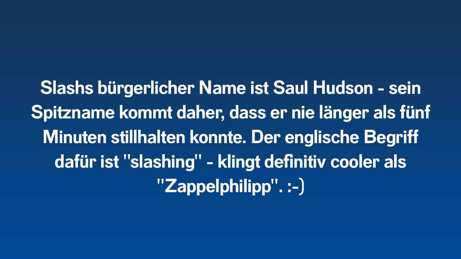 • Slashs bürgerlicher Name ist Saul Hudson - sein Spitzname kommt daher, dass er nie länger als fünf Minuten stillhalten konnte. Der englische Begriff dafür ist "slashing" - klingt definitiv cooler als "Zappelphilipp". :-) ROCK ANTENNE