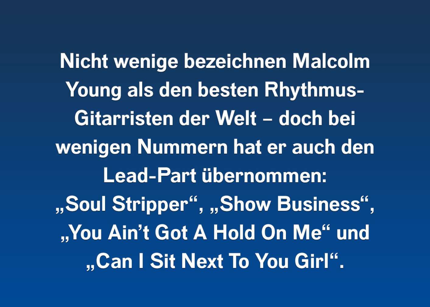 43 Jahre lang war Malcolm das Uhrwerk hinter der größten Band der Welt! Ihm ist es zu verdanken, dass AC/DC nie nachließen. Dass eine Scheibe Rock Or Bust (2014) auch mit einer Highway To Hell (1979) oder einer Back In Black (1980) mithalten kann - was man natürlich nie zugeben würde! Aber wie Angus Young schon einmal auf den Vorwurf, AC/DC hätten zehn Platten aufgenommen, die sich alle gleich anhören, antwortete: "Das ist gelogen! Wir haben elf Platten aufgenommen, die sich alle gleich anhören!" Und was haben wir es ihnen zu danken!